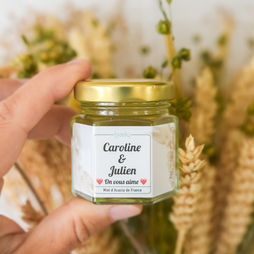 Personnalise ton mini pot de miel de mariage pour un cadeau unique qui a du sens.