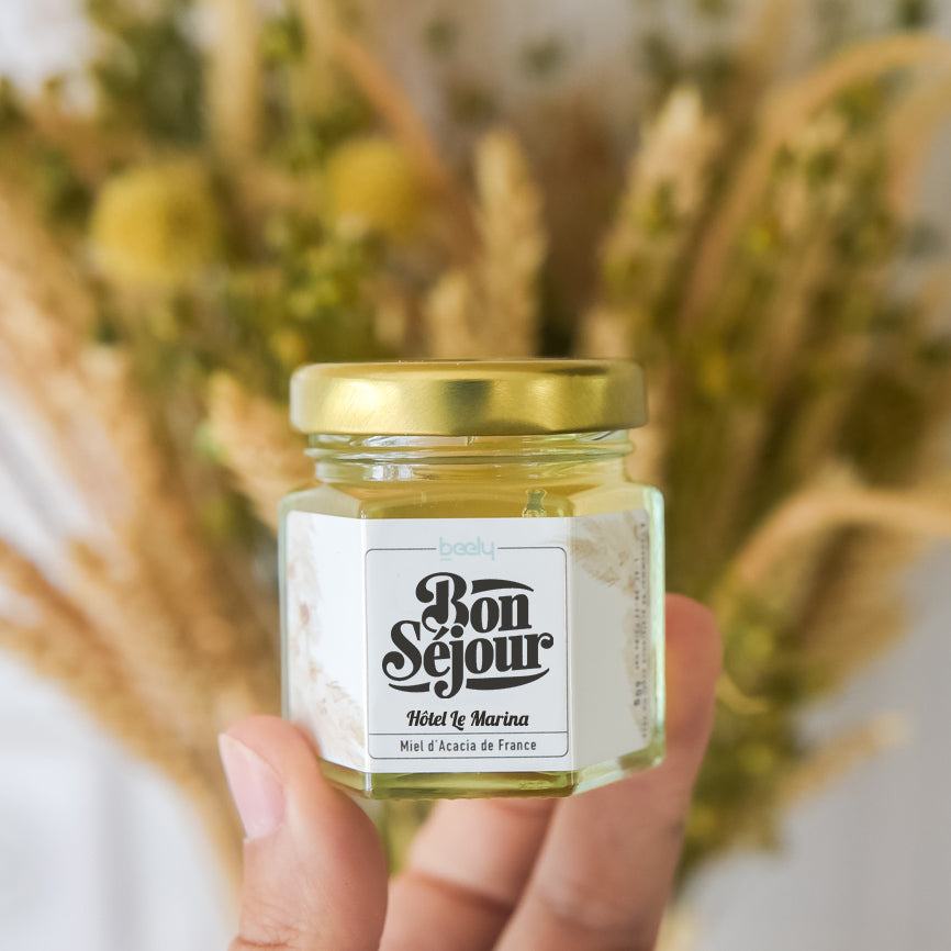 Le miel, produit naturel et apprécié de tous, constitue un cadeau de bienvenue idéal. En personnalisant les pots de miel avec le logo de votre établissement ou un message chaleureux, vous offrez à vos clients une attention gourmande et mémorable.