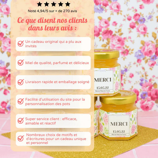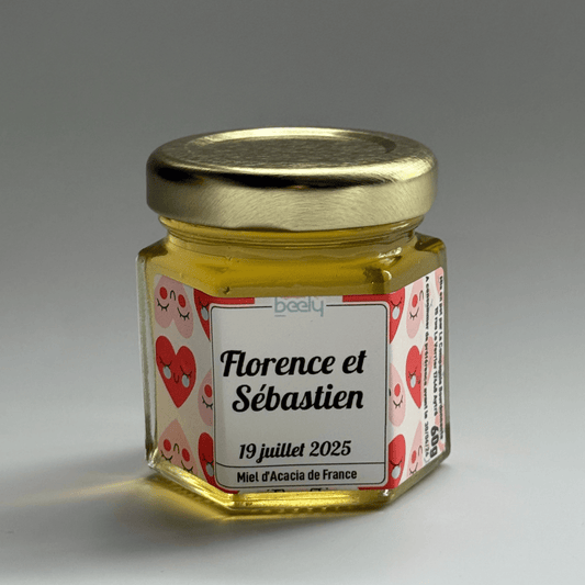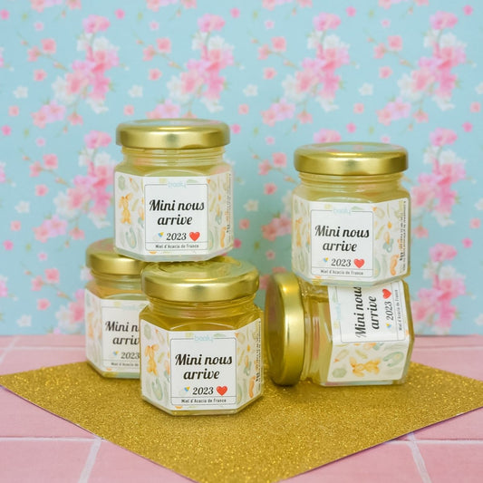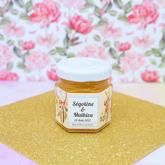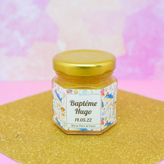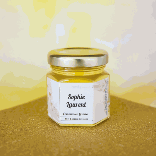 Découvre nos charmants pots de miel spécialement conçus pour offrir aux convives un délicieux souvenir de cette étape importante de la vie religieuse. Nos pots de miel sont disponibles en 50 designs personnalisables.