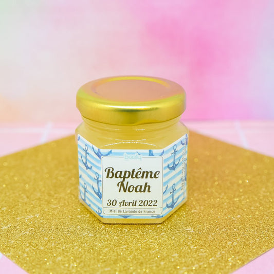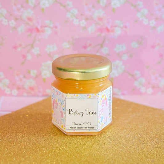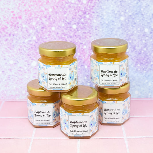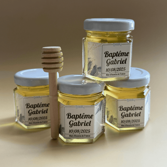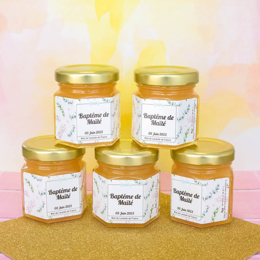 Choisis parmi une variété de miels et de designs pour créer le parfait souvenir pour tes invités (ça marche aussi comme idée de cadeau invité de baptême ) et leur offrir une belle alternative aux traditionnelles dragées.