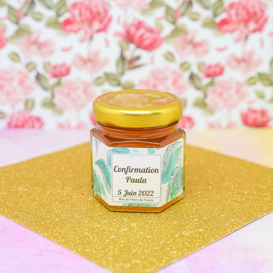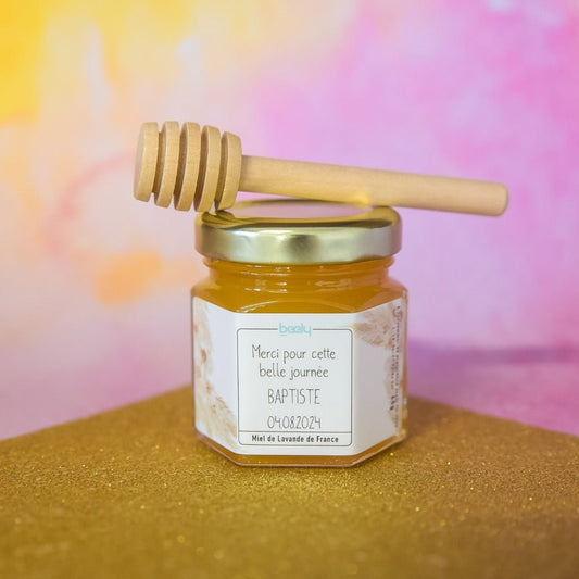 Nos pots de miel sont personnalisés avec une étiquette unique afin de rappeler à tes proches cette belle journée avec originalité et gourmandise.
