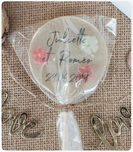 3) Des sucettes personnalisées fleuriesTu pourras y mettre vos prénoms et la date du mariage et même rajouter des fleurs en sucre à l’intérieur pour un côté encore plus champêtre