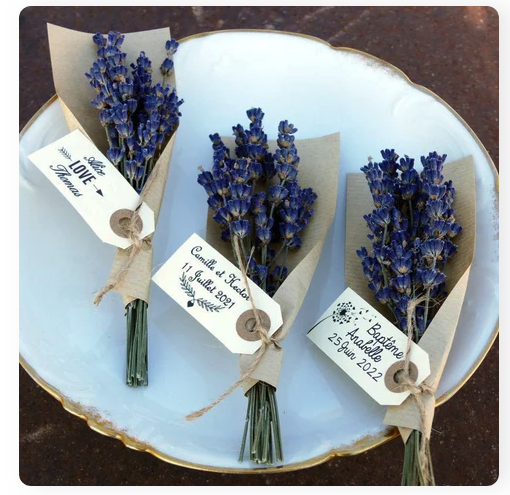 26) Des petits bouquets personnalisésCette composition de fleurs séchées est idéale pour créer une atmosphère chic et champêtre, tout en offrant un souvenir de mariage 100% naturel. Côté prix, il faut compter environ 4€ le bouquet personnalisé sur Etsy