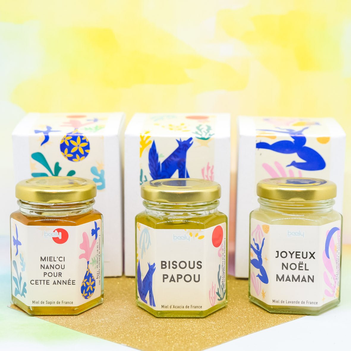3 formats de miel à personnaliser pour un cadeau de Noël aussi beau que bon :