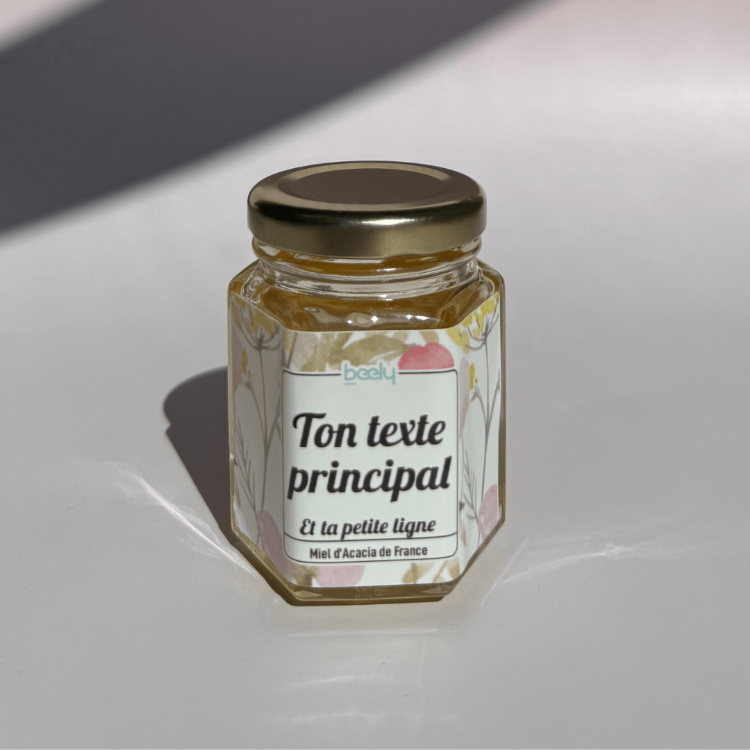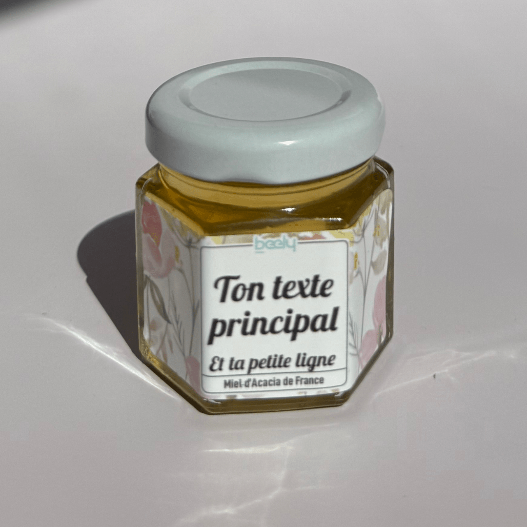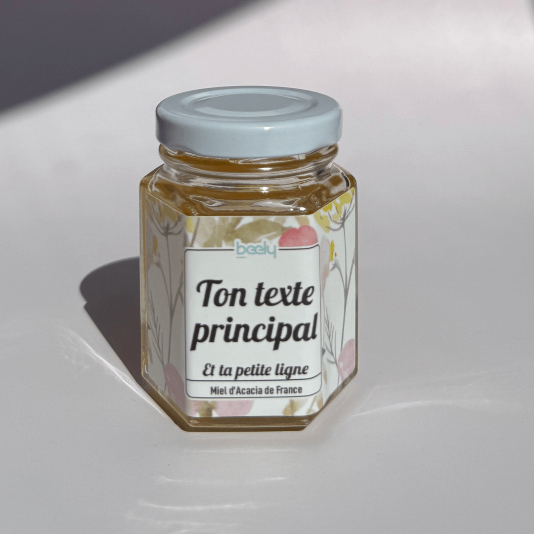 Apportez de la poésie et de la fraîcheur à vos événements avec notre petit pot de miel personnalisé – design Fleurs aquarelle.