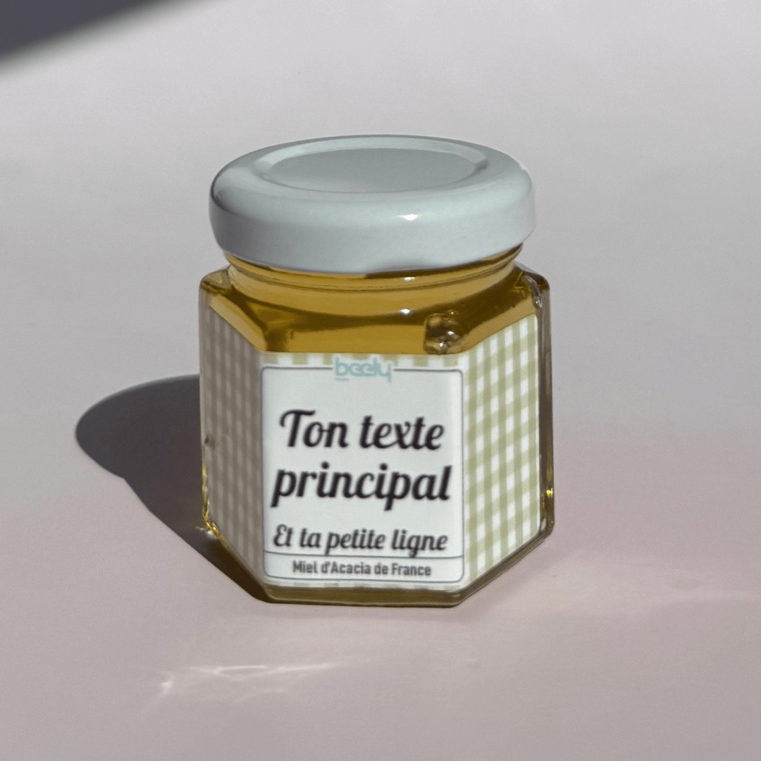 Apportez une touche fraîche et champêtre à vos événements avec notre petit pot de miel personnalisé – design Vichy Vert.