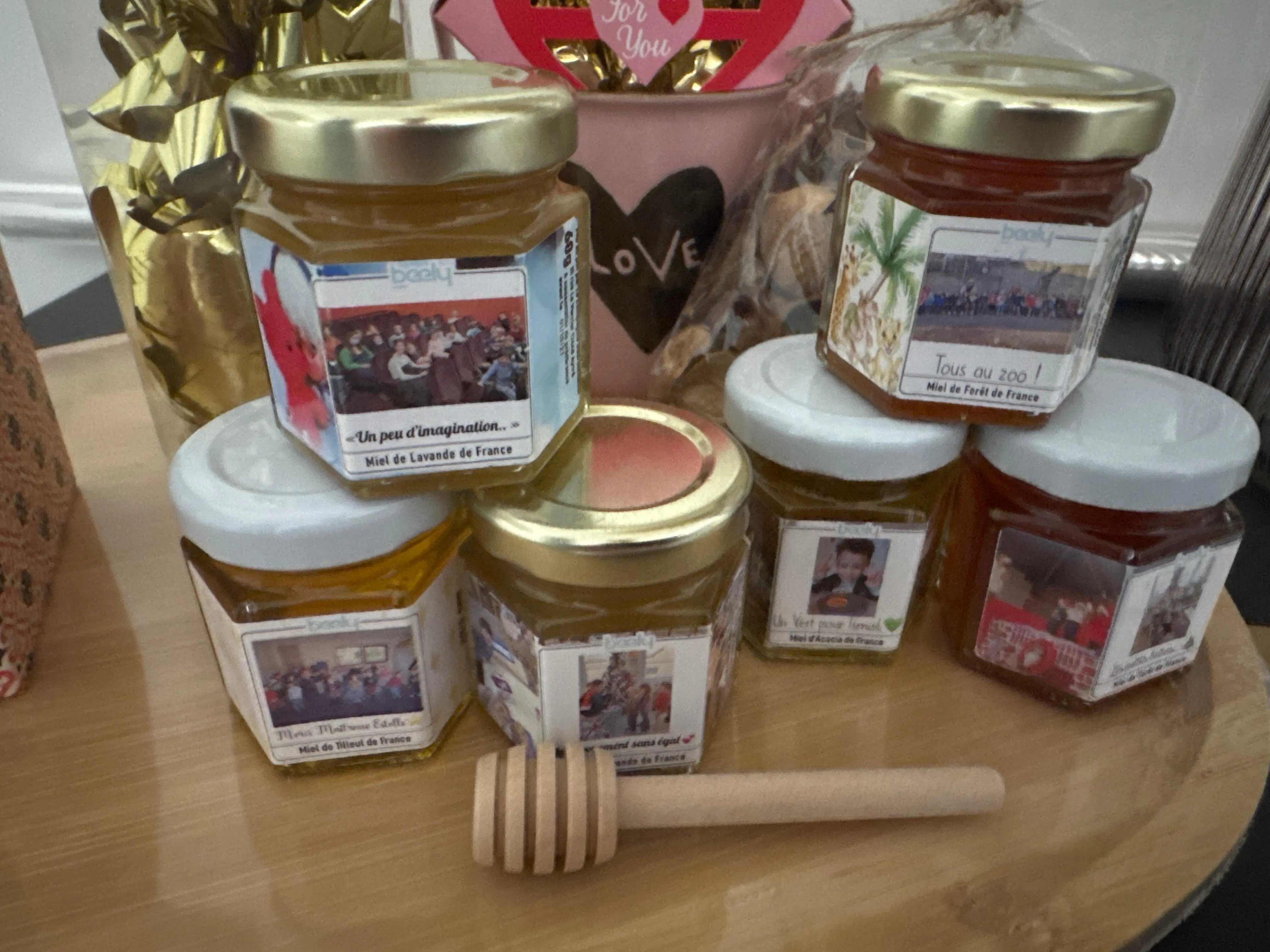 Nos pots de miel personnalisés sont bien plus que de simples cadeaux. Ils sont une véritable œuvre d'art qui raconte ton histoire et immortalise tes moments précieux. Que ce soit pour un mariage, un baptême, une baby shower ou même un cadeau d'entreprise, chaque pot est unique, à toi de créer le tien 😉